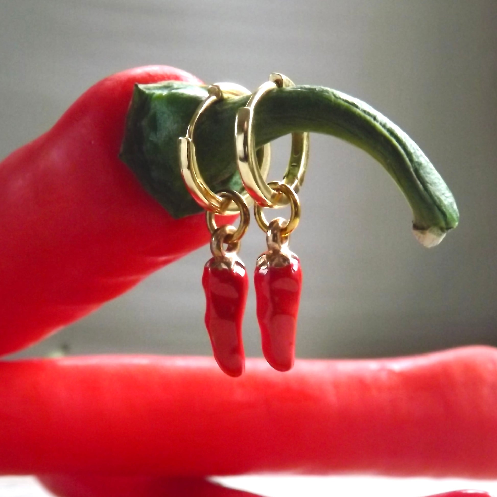 Composition: Enamel chilli charms. 18k gold plated sterling silver earrings.