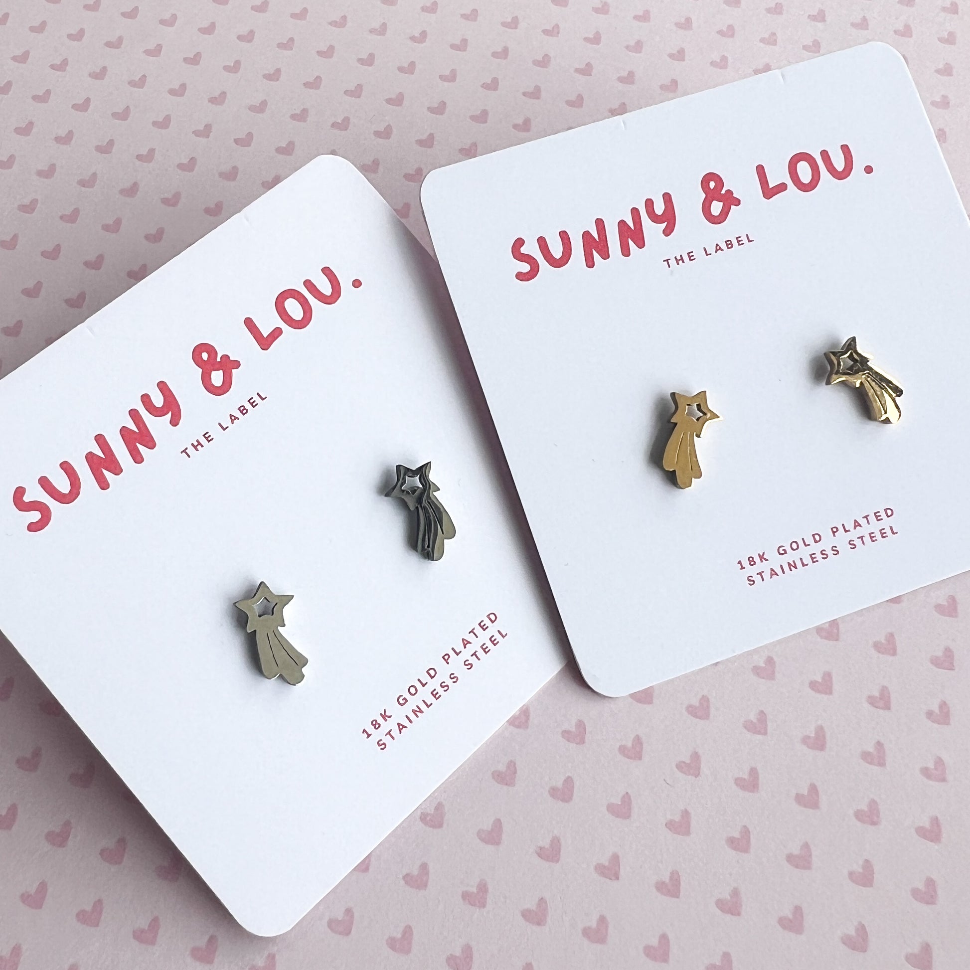 Description: Shooting star stud earrings with butterfly clasp backing. Small in size to suit little ears. Tarnish resistant and hypoallergenic.